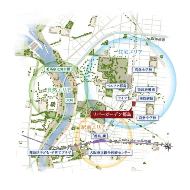 多彩な飲食店や店舗が集う賑やかな「都島」駅前からほどよく距離を置き、交通量の多い大通りからも奥まった、閑静な住宅街に本物件は誕生します。南東角地の開放感あふれる敷地を囲むのは低層住居中心の街並み。高層階からは、開放的な眺望を楽しむことができます。