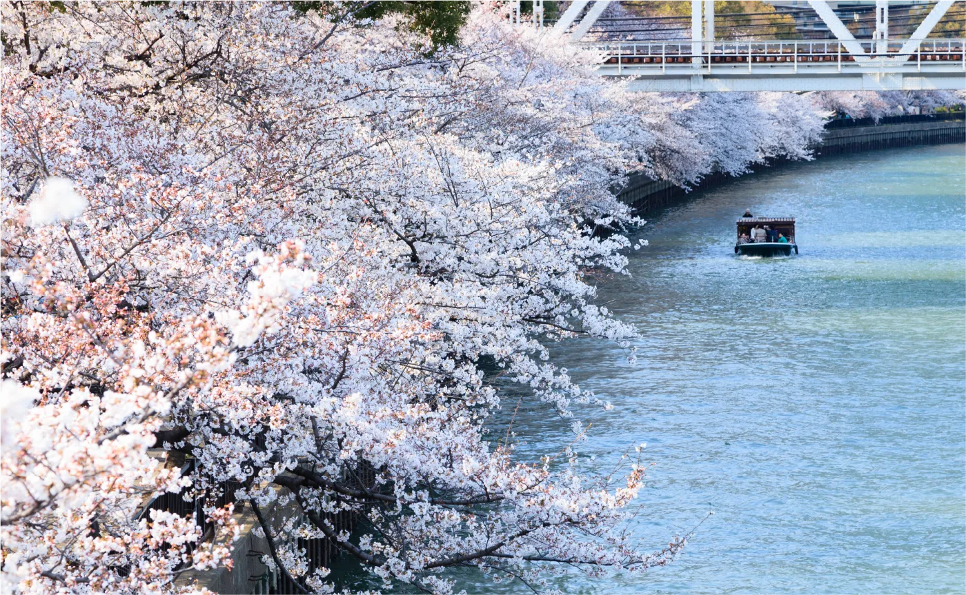 約4,800本の桜並木が咲き誇り、大川に美しい姿を映し出します。