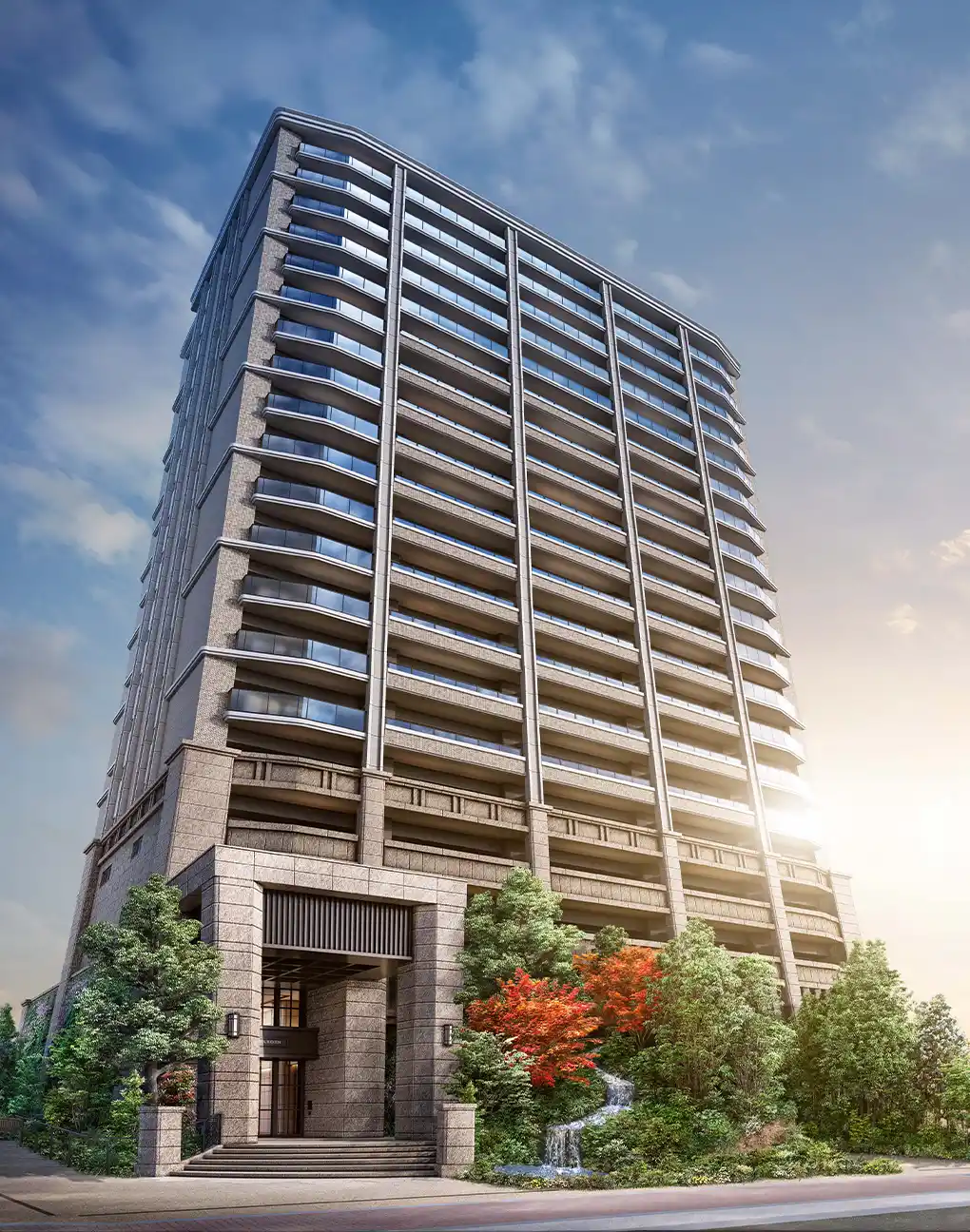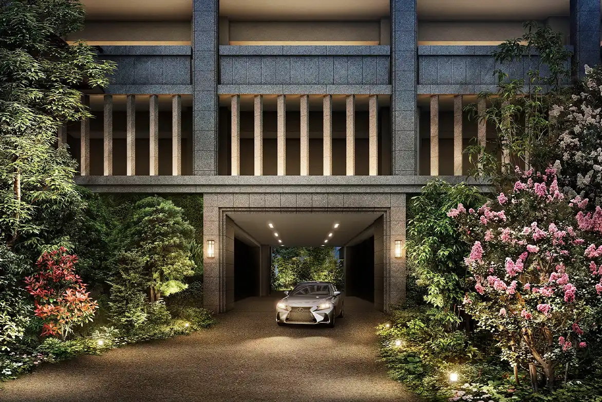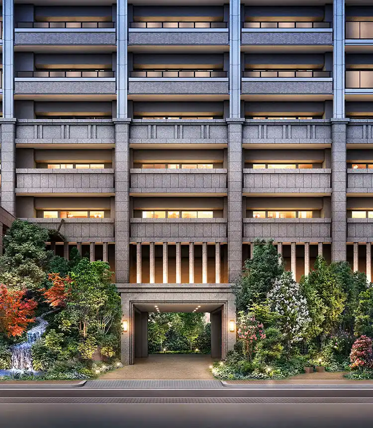 ひときわ目を引くルーバーデザインが重厚感と気品を湛えるファサード。建物基壇部には、錆御影石などの天然石をはじめとした素材をふんだんに採用し、天然素材の質感とぬくもりを活かした、繊細で洗練された意匠に仕上げました。夜には柔らかな明かりに照らされ、より印象的に。素材の美しさが際立つ設えが、住まう方を迎えます。