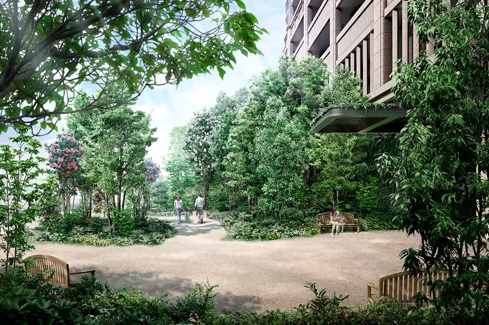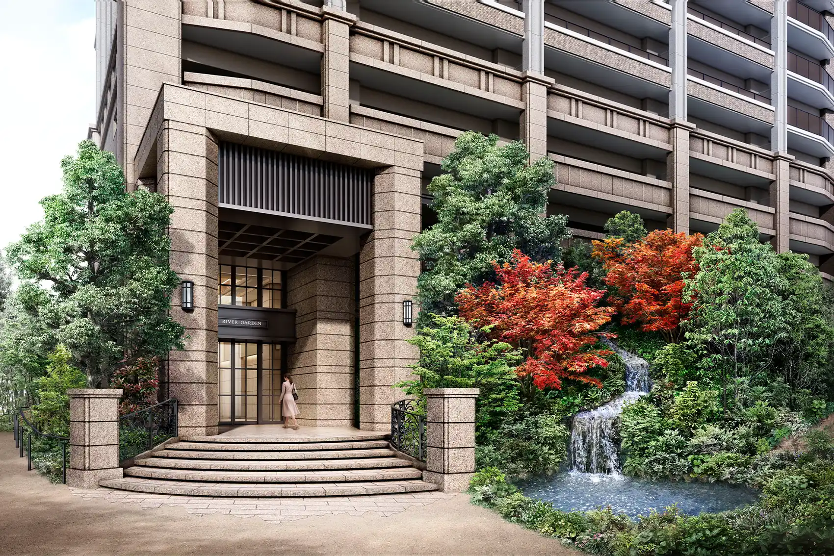 敷地の約58%、870㎡を超える広大なガーデン。約1,100本の樹々、約9,200株の草花、2段の滝が街並みを彩ります。木々や草花が季節ごとの表情を見せ、やさしく流れる滝の音が日常に潤いを添える。都心部にありながら自然とともに過ごす、心ほどける時間がここにあります。