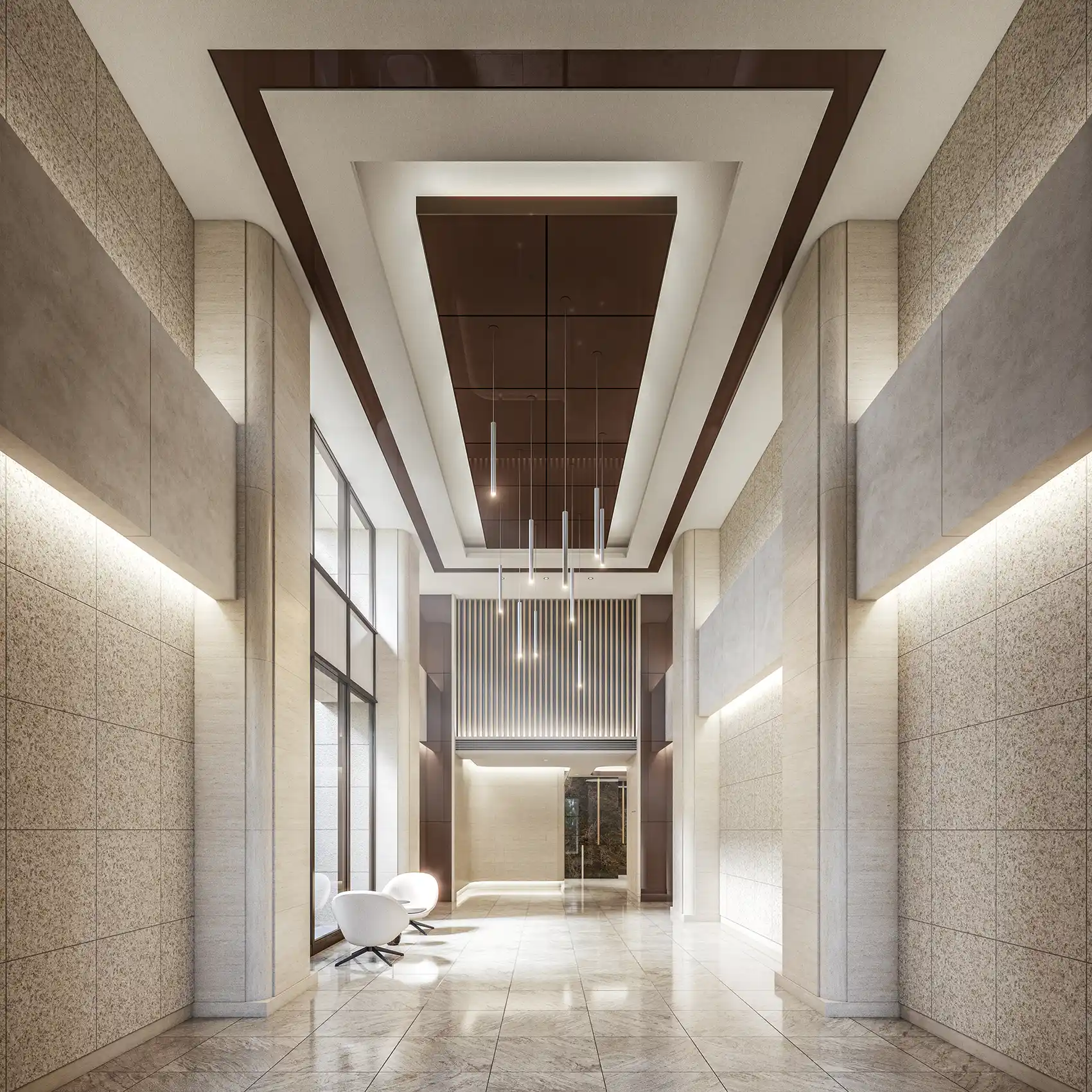 ライムストーンや錆御影石を基調にブロンズミラーをアクセントとして散りばめ、デザイン性の高い空間に仕上げたエントランスホール。天井には特注のペンダントライトが星のように輝き、迎賓の美を創出しています。