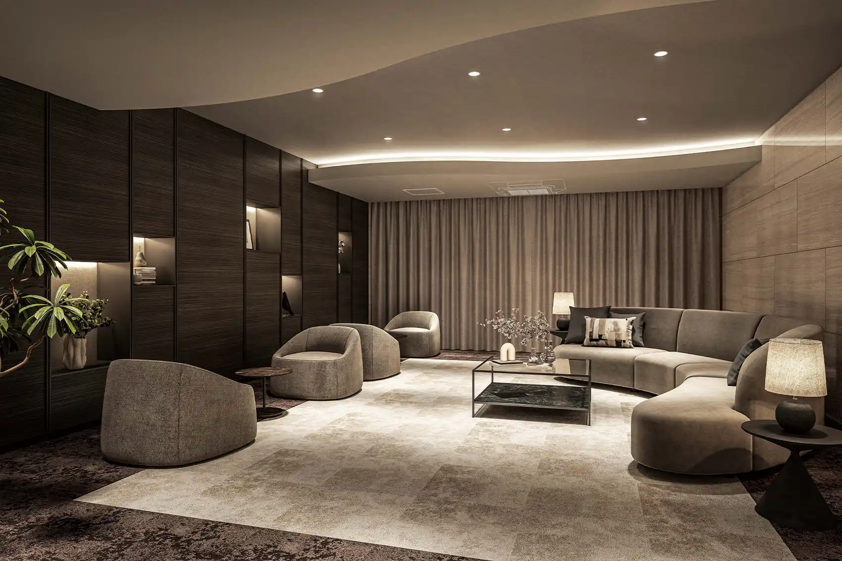 オーナーズラウンジは、落ち着いた木調の壁面意匠と趣向を凝らした調度品が上質な空間を演出。流れるようなカーブが印象的なソファに合わせ、間接照明の意匠にも工夫を凝らしました。あなただけのサードプレイスとして、くつろぎのひとときを過ごせます。